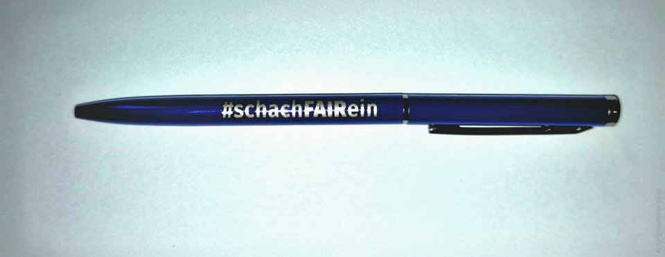Kugelschreiber mit Schriftzug „#schachFAIRein“.